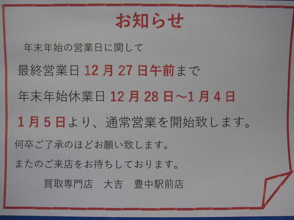 12月27日午前中までを年内最終営業とし、12月28日~1月4日までを年末年始休業日に致します。